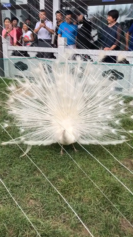 逛动物园偶遇白孔雀开屏 引众人围观 实在是太美了
